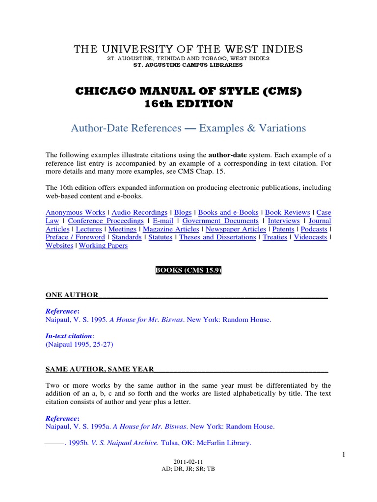 However, in a work that does not include a bibliography, it is recommended that the full citation be repeated when it is first used in a new chapter. Guidelines for cms note citation citation in text. For numerous specific examples, see chapters 14/15 of the chicago manual of style, 16th edition.