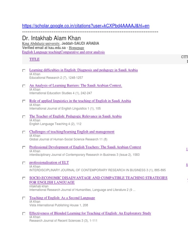 Intakhab Alam KhanGoogle Scholar Citations English As A