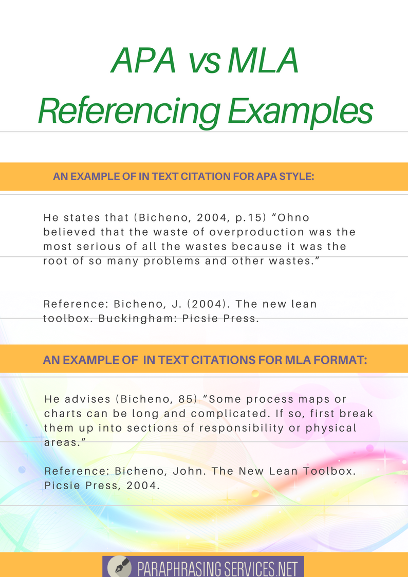 In this research guide you'll find pages on apa citation style (7th and 6th editions) and mla citation style, including examples of various types of citations like ones for books, articles and web sites. Even though mla and apa are popular citation styles that are taught in thousands of schools each year, there are always tons of questions about the differences between the two. (name, year, page number) such as.