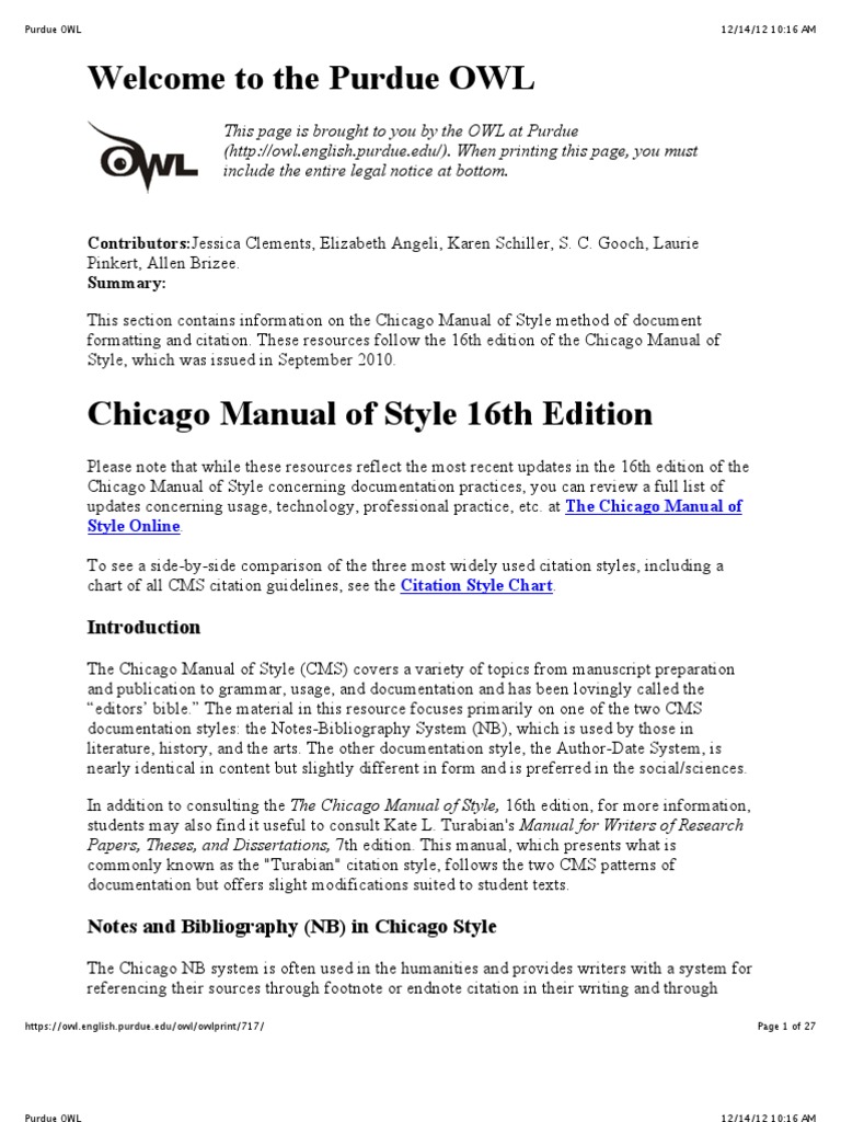 The chicago nb system is often used in the humanities and provides writers with a system for referencing their sources through footnote or endnote citation in their writing and through bibliography pages. Owl purdue chicago manual presentation Formatted according to the chicago manual of style 17 th edition.